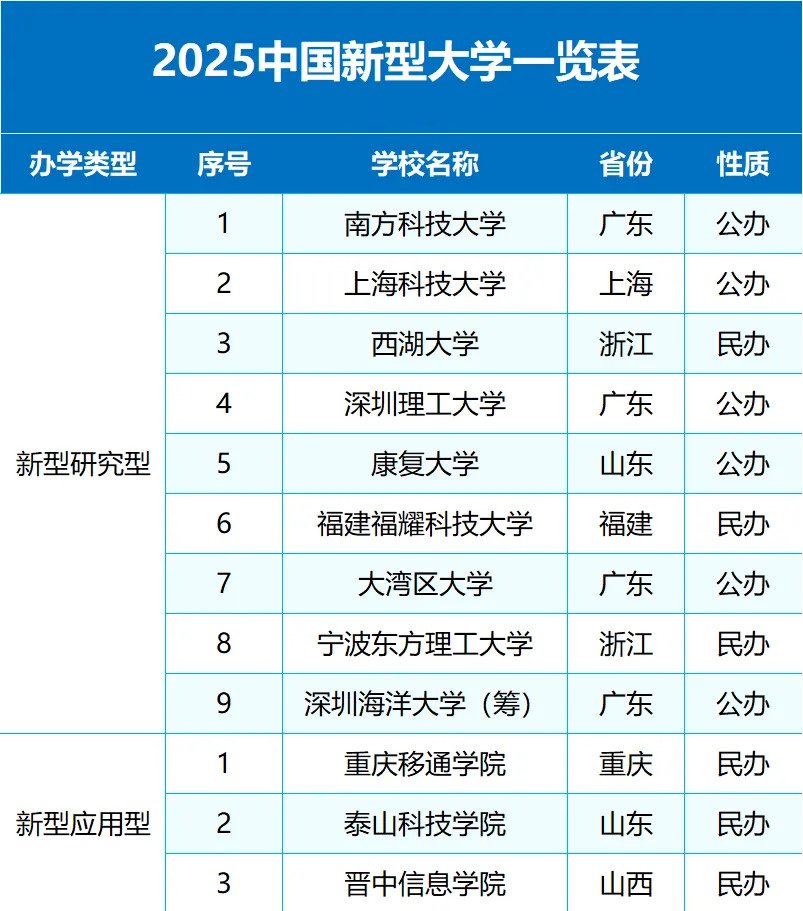 国内新型研究型大学,分别有南方科技大学(2012)、上海科技大学(2013)、西湖大学(2018)、深圳理工大学(2024)、康复大学(2025)、福建福耀科技大学(2025)、大湾区大学(2025)、宁波东方理工大学(2025)以及深圳海洋大学(筹);其中2020年之后成立的新型大学,在教育部同意设置成立函中均明确了定位。